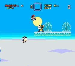 The second section uses from Romancing SaGa 3 for the background, from Super Mario World, Super Mario World 2: Yoshi's Island and from Pop'n Twinbee: Rainbow Bell Adventures for the foreground and from Yoshi's Island for the enemies.