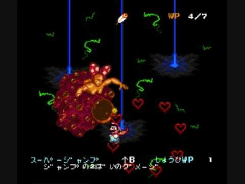 In the Crash part, the graphics are from ActRaiser 2 for the foreground and the background and from Super Mario World, Super Mario World 2: Yoshi's Island and custom-drawn for the enemies.